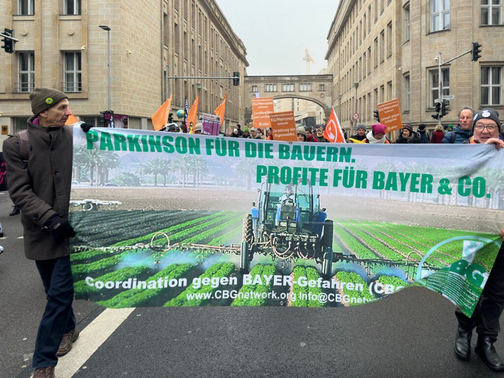 „Haltung zeigen! Für eine zukunftsfähige Landwirtschaft weltweit“ – unter dieser Losung stand am 17. Januar die diesjährige „Wir haben es satt“-Demo. Rund 8.000 Menschen nahmen teil, darunter auch AktivistInnen der Coordination gegen BAYER-Gefahren (CBG). Gemeinsam gingen sie in Berlin für eine Landwirtschaft auf die Straße, die nicht mehr Großkonzernen wie ALDI, BAYER & Co. ausgeliefert ist. „Dieses agro-industrielle Modell sorgt für rund 30 Prozent aller Treibhaus-Emissionen, vergiftet die Gewässer, laugt die Böden aus und macht die Menschen krank“, hieß es in der Pressemitteilung der Coordination. Eine dieser Gesundheitsgefährdungen stellte die CBG auf ihrem Transparent besonders heraus: die Pestizid-Nebenwirkung Parkinson, die bei Bauern und Bäuerinnen nunmehr offiziell als Berufskrankheit anerkannt ist.
