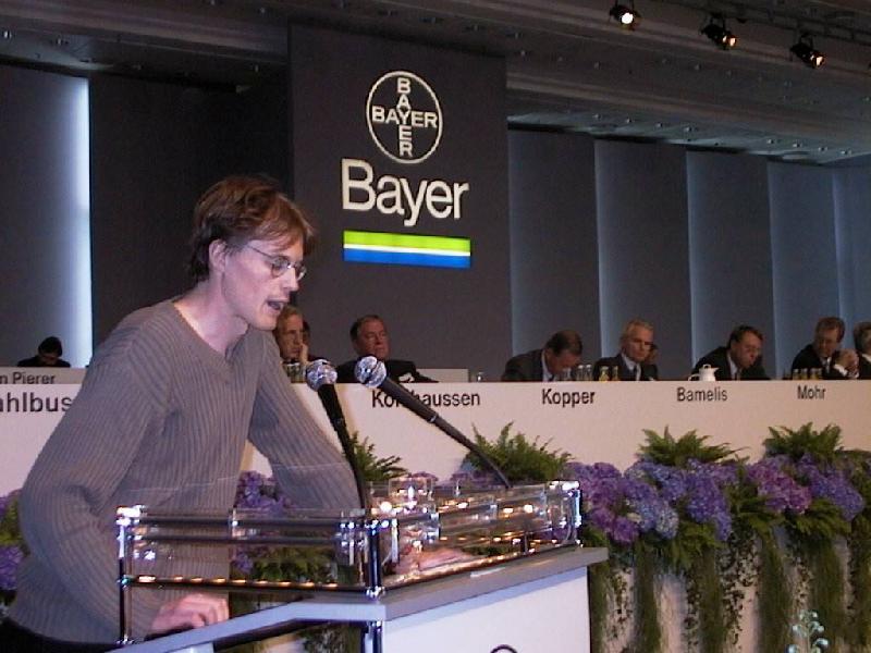Zehn BAYER-KritikerInnen sprachen auf der Hauptversammlung und dominierten damit eindeutig die RednerInnen-Liste. Als erste trat Christiane Niesel von der Kölner Gruppe ANTIGEN vor das Mikrofon. Sie griff die Große Koalition zur Durchsetzung der Gentechnologie, bestehend aus Wirtschaft, Politik und Wissenschaft, an und nannte die Gründung des Rechtsrheinischen Technologie-Zentrums in Köln-Kalk sowie des Interessenverbandes BIOGENTECH NRW als Beispiele. Eine direkte Frage richtete Niesel an Ernst-Ludwig Winnacker: „Warum kann eigentlich ein Aufsichtsratsmitglied von BAYER auch in der Funktion als Leiter des Institutes für Genetik in München und als Präsident der DEUTSCHEN FORSCHUNGSGEMEINSCHAFT auftreten?“