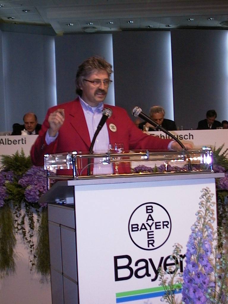 Als der Vorstandsvorsitzende auf die zahlreichen Gegenanträge zu sprechen kam, die „die bekannte Gruppierung“ zu Themen wie „gefährliche Pestizide“ oder „Ausgliede- rungen“ einbrachte, bemühte er sich nicht einmal mehr um Sprachkosmetik. Schneider recycelte einfach seine Worthülsen aus vergangenen Hauptversammlungen. „Die Hauptversammlung ist nicht der Ort, um über wissenschaftliche Fachfragen zu debattieren“, war einer dieser altgedienten Textbausteine.Die Gegenanträge nannte er „einseitig“, „unsinnig“ und „rechtlich fragwürdig“ und „ unbegründet“ – die alte BAYER-Leier.