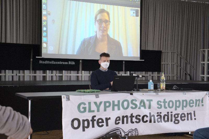 Zum Auftakt sprach die Köchin und derzeit als Parteilose für die österreichischen Grünen im EU-Parlament sitzende Sarah Wiener – live per Internet zugeschaltet – ein Grußwort. „Pestizide allgemein haben in unserer Umwelt nichts verloren“, stellte sie gleich zu Beginn klar. Dann berichtete Wiener vom Stand der Dinge bei dem Versuch Österreichs, Glyphosat zu verbieten, und gab Einblick in ihre Parlamentsarbeit. Sie klagte über die Landwirtschaftspolitik, die Millionen an Subventionen in die alten agro-industriellen Strukturen pumpt, sah allerdings auch Hoffnungsschimmer wie die avisierte neue Chemikalien-Politik. Der allerdings droht Ungemach durch das Extrem-Lobbying von BAYER & Co. Umso mehr baute Sarah Wiener deshalb auf Druck von außen: „Ich finde es toll, dass ihr so engagiert seid und uns den Rücken stärkt.“