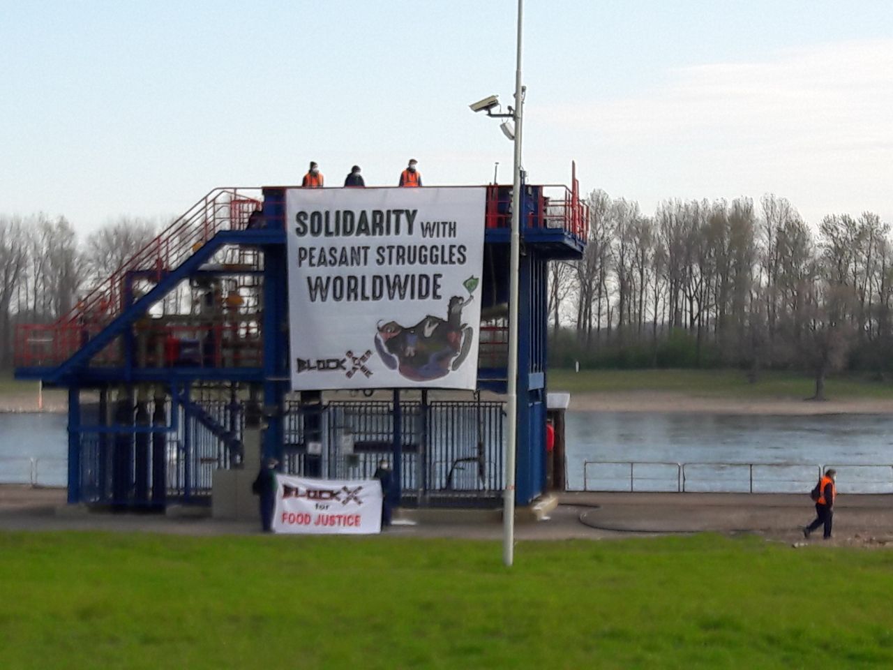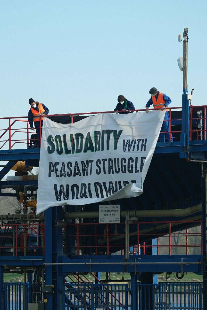 Dormagen/Leverkusen, 16.04.2021. Heute früh gelang es mehreren AktivistInnen der Kampagne „Block BAYER“, zwei Verladestationen des Chemieparks Dormagen zu besetzen. Die Salzverladestationen am Rhein gehören zu einer Chlorgasgewinnungsanlage, die auch die Pestizidproduktion von BAYER Crop Science versorgt. Mit ihrer erfolgreichen Aktion machen sie auf die Doppelstandards des Konzerns aufmerksam, der weiter hochgefährliche Pestizide produziert und verkauft, die in der EU nicht zugelassen sind. In Solidarität mit gefährdeten Bäuerinnen und Bauern findet die Aktion zum Internationalen Tag des bäuerlichen Widerstands (17.04.) statt.
