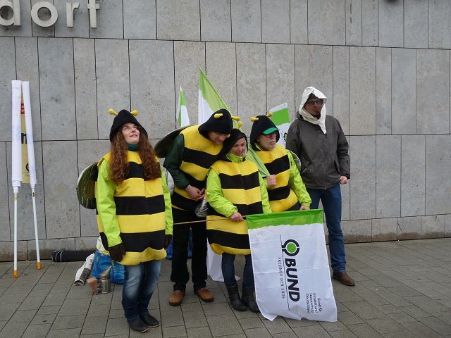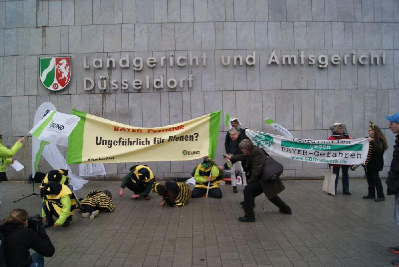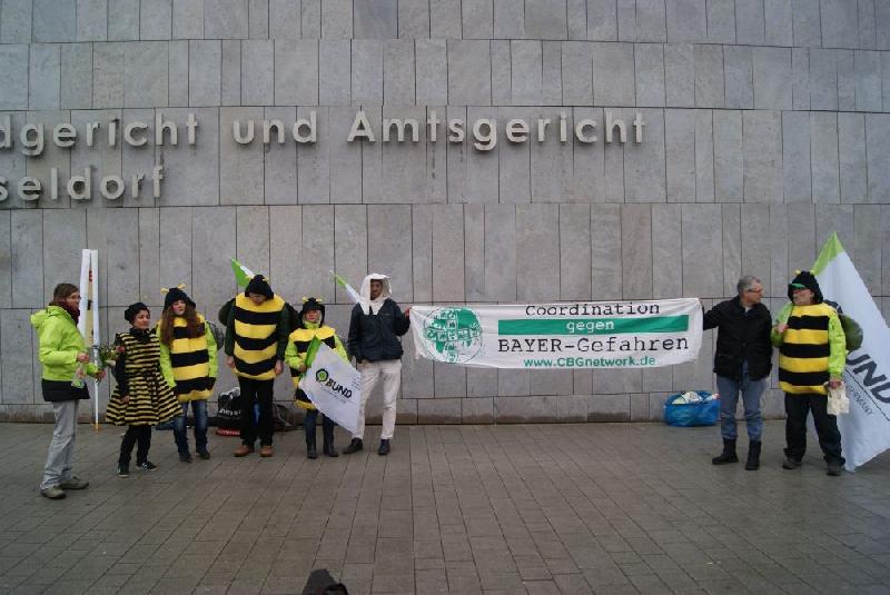 Der Anwalt des BUND erklärte vor Gericht, das Vorgehen von BAYER sei der „Versuch einer Einschränkung der freien Meinungsäußerung“. Am Eingang zum Landgericht demonstrierten als Bienen verkleidete Aktivist/innen gegen die Einschüchterungsversuche des Konzerns. Hierzu hatte auch die Coordination gegen BAYER-Gefahren (CBG) aufgerufen. Die CBG arbeitet seit 1998 zu bienenschädigenden Pestiziden.