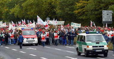 Auf dem Protestzug über die Kaiser-Wilhelm-Allee und die Bundesstraße 8 zur Betriebsversammlung waren die Mitarbeiter immer mehr in Rage geraten: Als die Stadtgrenze nach Köln überschritten wurde, blockierte der Tross die gesamte Bundesstraße, Verkehrsstaus waren die Folge. Viele hatten sich neben den Trillerpfeifen und Plastik-Umhängen mit IG-BCE-Logo auch mit einem gelben Aufkleber ausstaffiert: Darauf bezeichneten sie sich als „Sonderabfall“ mit der Herkunftsbezeichnung BIS.