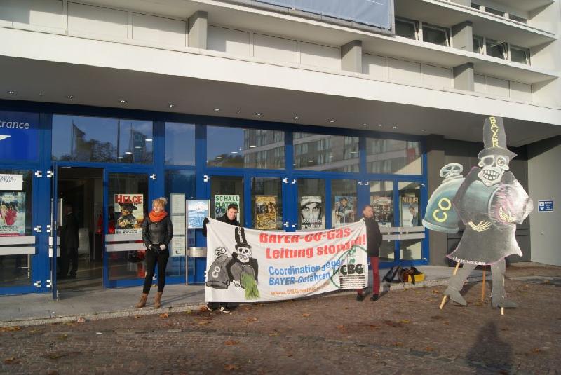 Die Coordination gegen BAYER-Gefahren, die ebenfalls eine Einwendung eingereicht hatte, protestierte vor der Halle mit einem überlebensgroßen Sensenmann gegen das Projekt (siehe Foto). In der Erörterung stellte Philipp Mimkes vom CBG-Vorstand den Antrag, den Kohlenmonoxid-Unfall im Brunsbütteler BAYER-Werk vom 24. September zum Gegenstand des Verfahrens zu machen, weil er für die Sicherheit der Pipeline von Bedeutung sein könne. Die Bezirksregierung lehnte eine Erweiterung der Tagesordnung jedoch ab. „Von BAYER gibt es bis heute keinerlei Informationen über dieses Unglück, das zwei Mitarbeiter fast mit dem Leben bezahlt haben. Wie soll man die Beteuerungen glauben, wonach die Pipeline sicher sei, wenn nicht einmal die Mitarbeiter innerhalb der Werke wirksam geschützt werden können? Die Bezirksregierung sollte dringend die Ermittlungsergebnisse der Staatsanwaltschaft Itzehoe anfordern und diese in der laufenden Erörterung vorstellen“, so Philipp Mimkes.