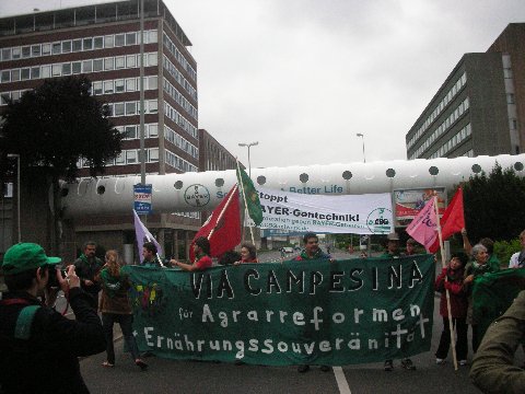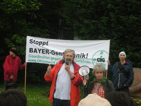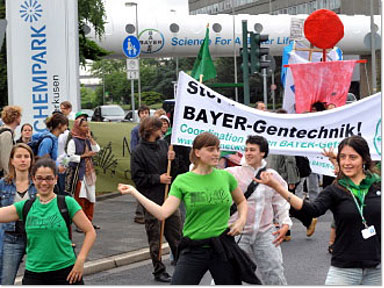 Hundert Menschen machen sich am 17. Mai von Bonn aus nach Leverkusen auf. Mit Straßentheater, Demo-Ballett und kunstvoll gestalteten Figuren machten sie ihrem Unmut über die Geschäftspolitik des Agro-Multis Luft. „Wir protestieren gegen BAYERs Lobby-Anstrengungen, die Patentgesetze noch härter zu machen. Wir erlauben es nicht, unsere genetischen Ressourcen zu privatisieren“, skandierten Mitglieder der internationalen FarmerInnen-Organisation VIA CAMPESINA. Und ihr Sprecher José Oviedo erklärte in seiner Rede: „Agrogifte und gentechnisch veränderte Pflanzen, die von BAYER über die Welt gebracht werde, zerstören die lokalen Gemeinschaften, die seit Jahrhunderten Biodiversität geschaffen haben. Wenn wir Biodiversität erhalten wollen, müssen wir BAYER und ähnliche Firmen stoppen“. Petra Buhr vom NETZWERK FREIES WISSEN pflichtete ihm bei und kritisierte in ihrem Beitrag vor allem die Forschung des Leverkusener Multi zur Terminator-Technologie. Axel Köhler-Schnura schrieb derweil das „Schwarzbuch BAYER“ weiter: „Produkte von BAYER sind für Todesfälle in aller Welt verantwortlich – von hochtoxischen Pestiziden bis hin zu gefährlichen Pharmaprodukten“. Und zum Schluss gab die versammelte Schar BAYER alles schriftlich: Die AktivistInnen überreichten dem Multi einen Offenen Brief mit dem ganzen Sündenregister.
