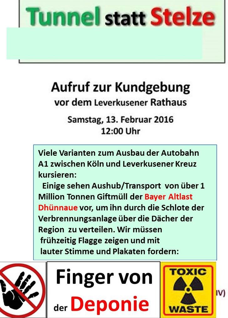 Die Coordination gegen BAYER-Gefahren ruft zur Teilnahme an der morgigen Kundgebung vor dem Leverkusener Rathaus auf. Unter dem Motto „Tunnel statt Stelze“ fordern mehrere Leverkusener Initiativen, die Autobahn A 1 künftig in einem geschlossenen Tunnel durch die Stadt zu führen (Beginn: 12 Uhr).