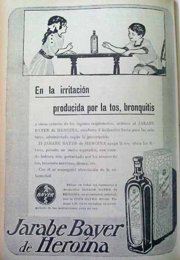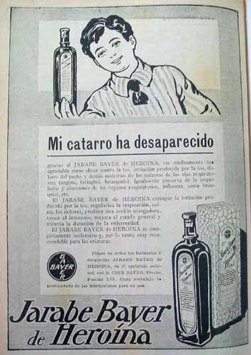 En la primavera de 1912, la compañía Bayer inició una campaña publicitaria de la heroína en los periódicos españoles. Algunos de esos anuncios han vuelto a salir a la luz. La empresa sacó al mercado este “remedio contra la tos de fácil digestión, junto al analgésico Aspirina, en 1898.