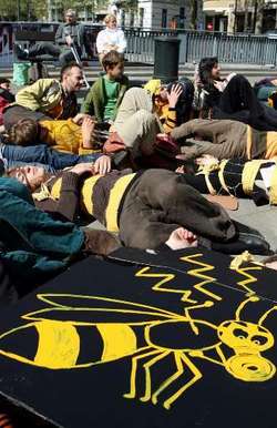 Une cinquantaine d‘activistes déguisés en abeilles ont simulé ce samedi après-midi devant le siège bruxellois du géant chimique allemand Bayer, sur l‚avenue Louise à Bruxelles, la mort de ces insectes, décimés selon eux par les insecticides, dont le Gaucho produit par cette firme. Réunis au sein du collectif Bzzut, ils entendaient ainsi rendre hommage aux abeilles décédées ce printemps.