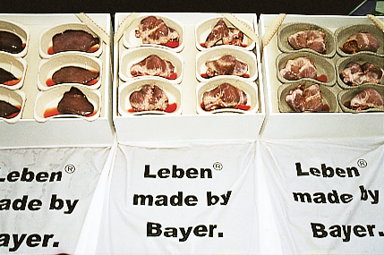 “Ein Herz von BAYER ertönt es laut. Einer von zehn mit Bauchläden aus- gestatteten Kunst-Komparsen preist die in Nierenschalen gelegten Bio- pumpen aus kürzlich geschlachteten Schweinen an. Ein anderer offeriert Nieren. Der Regen nieselt auf die Innereien, die Behältnissen füllen sich mit leicht blutigen Pfützen. “Das ist ja ekelhaft, reagiert eine junge Frau empört. Schauspielerin Edda Fischer, u. a. bekannt aus diversen Soaps, hat sich unter die einströmenden Aktio- närInnen gemischt, verteilt Zettel mit rhetorische Aphorismen des verstor- benen Schriftstellers Max Frisch. “Was tun Sie für Geld? – diese Frage könnte symbolisch das Motto der dividendengeilen Couponschneider sein. Oder: “Wem gehört … die Luft? – eine Provokation für einen Konzern, der ohne Skrupel gigantische Mengen von Dreck aus seinen Schornsteinen rauchen lässt.