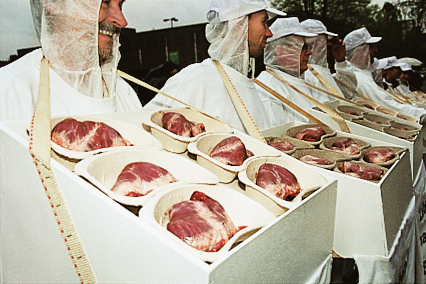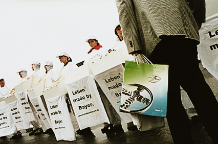Die Künstlerin C. R. inszenierte im Vorfeld der BAYER- Hauptversammlung am 28. April vor der Köln-Deutzer Messehalle ein tiefsinniges Bild. Zehn ganz in weiß gekleidete “Organhändler boten symbolisch frisch geklonte Nieren und andere Innereien feil – AgitPropArt als eindringlicher Protest gegen die immer beherrschender werdende Gentechnik.