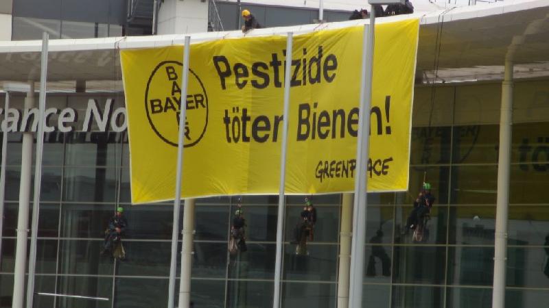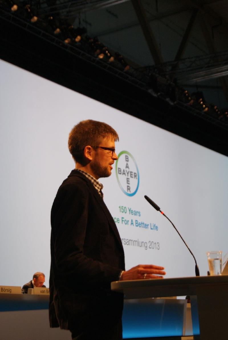 Ihr Motto „Science for a better life“ ist allgegenwärtig. Es steht in krassem Widerspruch zu Bayers Unternehmenspolitik. Eindeutige wissenschaftliche Erkenntnisse werden ignoriert und damit ein „besseres Leben“ akut gefährdet. Es liegt eine Fülle von Studienergebnissen zu Bienensterben und Effekten von Pestiziden auf Bestäubungsinsekten vor – und alle weisen in die gleiche Richtung: das Bienensterben hat verschiedene Ursachen. Entscheidenden Anteil aber haben Agrargifte, darunter auch von Bayer produzierte Insektizide. Wirklich überraschen kann das nicht, immerhin werden diese Gifte angewendet um Insekten zu töten. Von daher ist die einfache Wahrheit auf unserem Banner, „Pestizide töten Bienen“, auch richtig. Zudem aber wissen wir immer mehr über die schädlichen Wirkungen von Pestiziden über ihre direkte Tödlichkeit hinaus. Effekte auf das Nervensystem von Bienen etwa gefährden das Überleben der Insekten. Dieses „Gift für das Gedächtnis“, wie es die Süddeutsche Zeitung einmal genannt hat, kann schließlich auch töten. Wenn Sie sich selbst ein Bild von der Datenlage machen wollen empfehle ich Ihnen eine Mitte April veröffentlichte Greenpeace-Studie. Unter anderem werden Sie in dieser den Stand der Forschung zu den Bayer-Giften Clothianidin und Imidacloprid finden, die nach unserer Überzeugung zusammen mit 5 anderen Wirkstoffen, darunter drei weitere auch von Bayer angebotene, umgehend aus der landwirtschaftlichen Praxis verschwinden müssen.