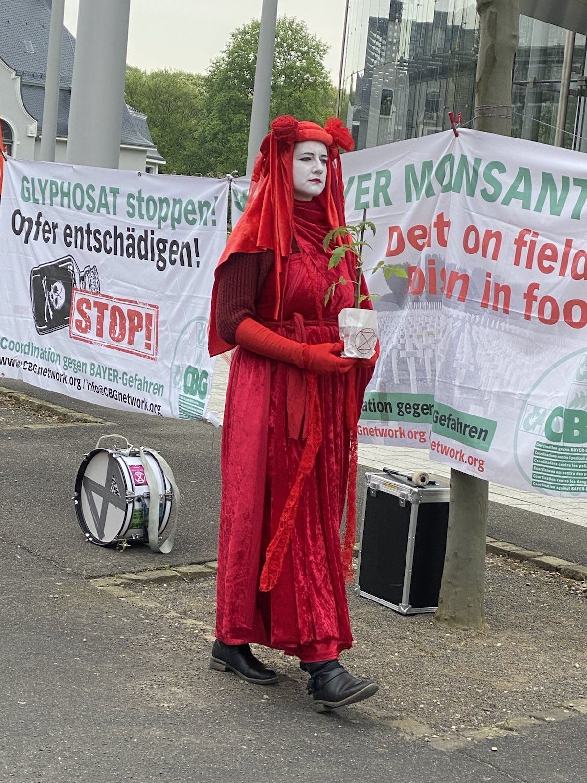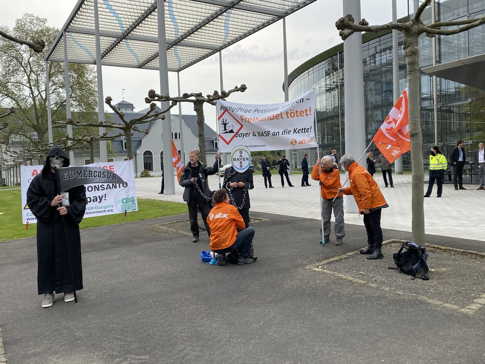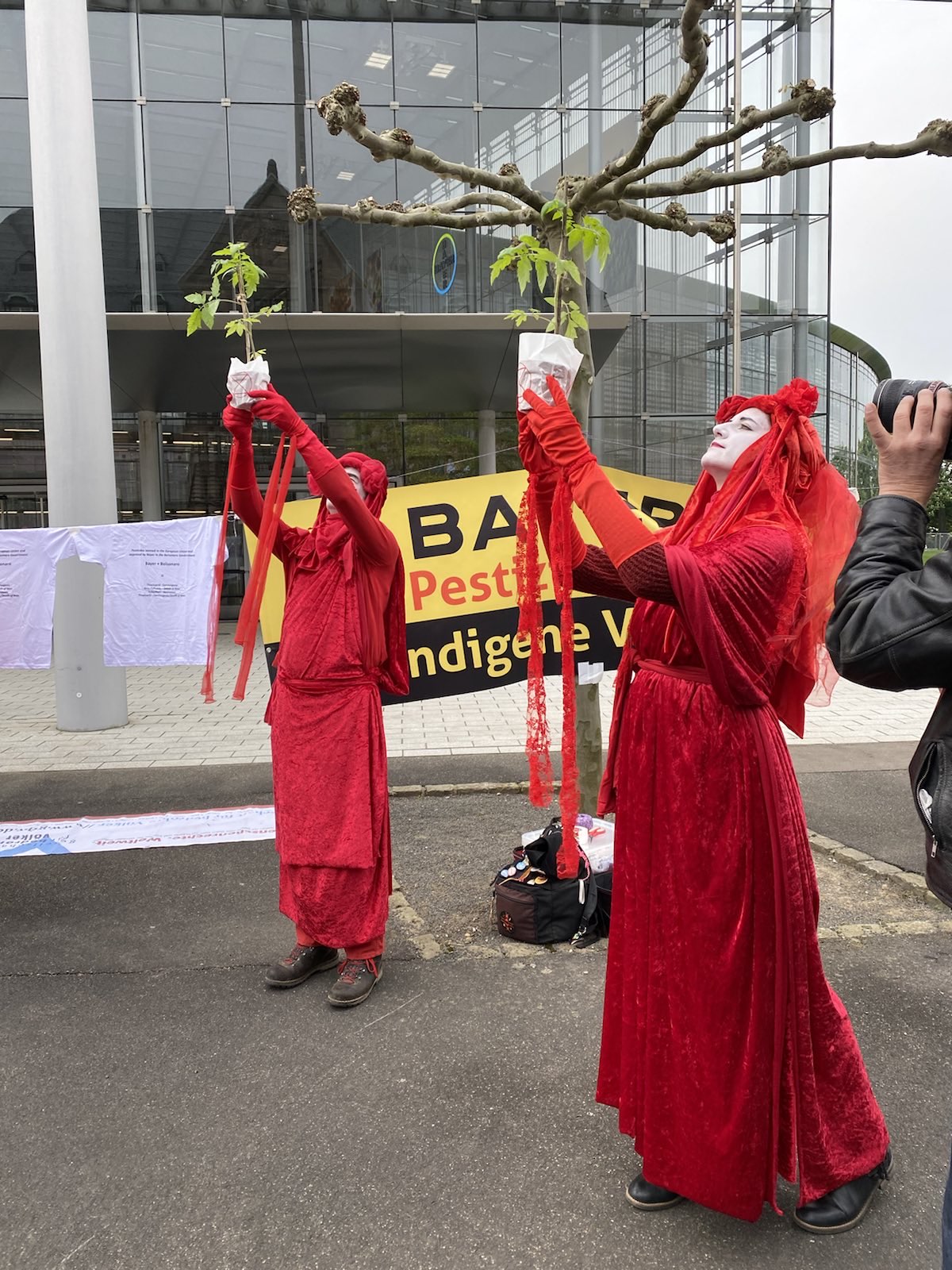 Während er das aussprach, protestierte vor dem Übertragungssaal ein breites Bündnis von Organisationen. Auf Einladung der CBG demonstrierten sie durch Leverkusen und sammelten sich vor der Konzern-Zentrale. Es sprachen Professorin Larissa Bombardi aus Brasilien und VertreterInnen des BUND, der Gesellschaft für bedrohte Völker, der Fridays For Future und andere (Liste siehe unten, CBG-Fotogalerie www.cbgnetwork.org/HV Nutzung für Presse freigegeben!).