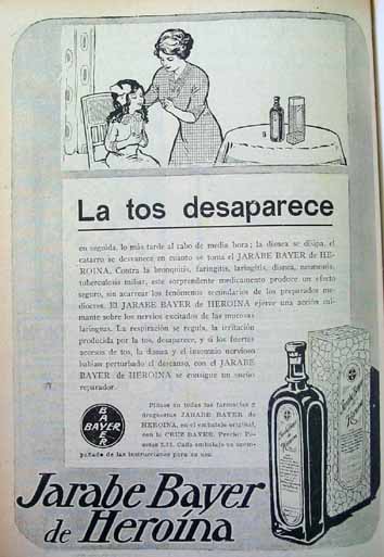 Nalla primavera del 1912 la BAYER iniziò una campagna pubblicitaria per l‘eroina, sui giornali spagnoli. Alcune di quelle pubblicità, sono state recentemente ritrovate. La multinazionale aveva lanciato il suo „ben tollerato rimedio per la tosse“ nel 1898, assieme all‚antidolorifico Aspirina.