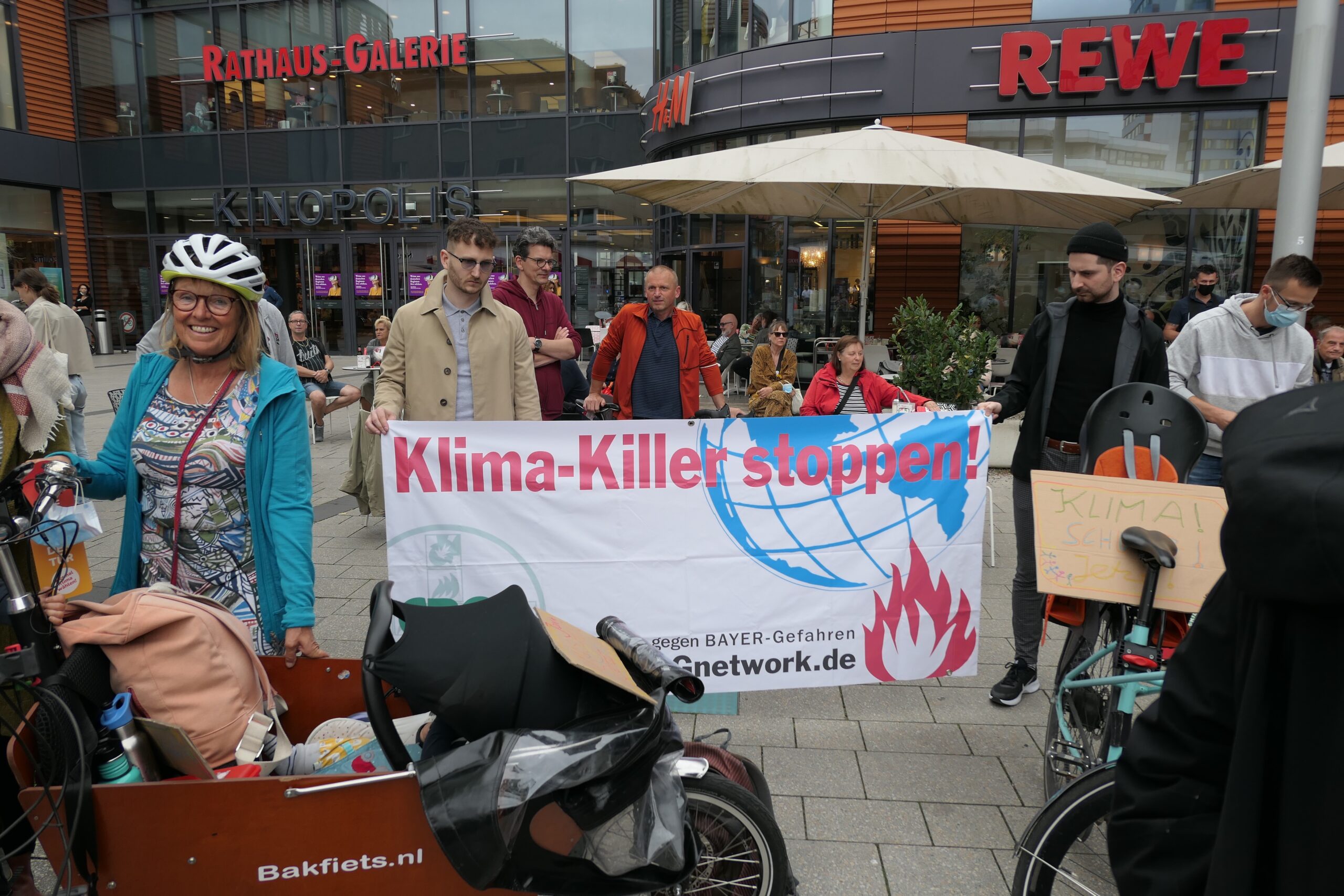 Die CBG zeigte mit ihrem Transparent die Rolle des größten CO2-Emittenten vor Ort: BAYER.