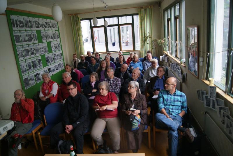 Während der Pause diskutiert CBG-Gründungsmitglied Axel Köhler-Schnura mit Interessierten über Perspektiven konzernkritischer Arbeit