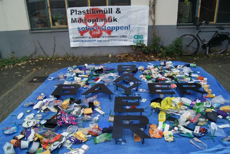 Als einer der weltgrößten Kunststoff-Produzenten ist der BAYER-Konzern (mit seiner neuen Tochterfirma COVESTRO) für dieses Umweltdesaster mitverantwortlich. BAYER-Produkte wie Polycarbonat, MDI oder TDI sind biologisch kaum abbaubar und können die Biosphäre über Jahrhunderte hinweg belasten. Kunststoffe im Meer werden durch Wind und Wellen klein gerieben und von Mikroorganismen oder Fischen aufgenommen. Besonders unverantwortlich sind Kunststoffe aus der BAYCUSAN-Reihe, die der Konzern als Grundstoffe für Haarpflegemittel, Lotionen, Hautcremes und Putzmittel anbietet. Da die Klärwerke nicht in der Lage sind, den Eintrag in die Gewässer zu verhindern, wurden solche Kunststoffe bereits in Lebensmitteln nachgewiesen.