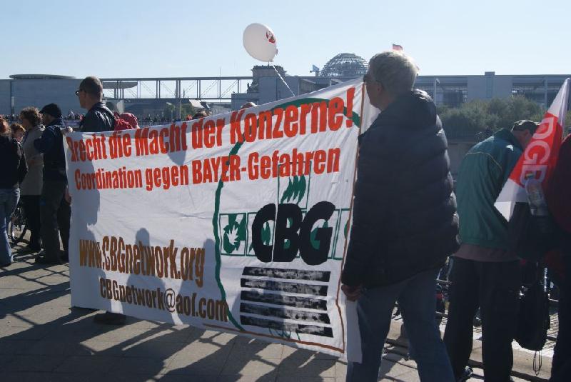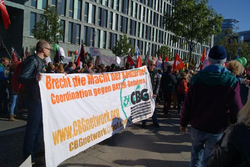 Die Coordination gegen BAYER-Gefahren gehörte zu den Organisationen, die zur großen TTIP-Demo in Berlin aufriefen. Zusammen mit über 200.000 Menschen zogen wir durch das Berliner Regierungsviertel bis zur Siegessäule.