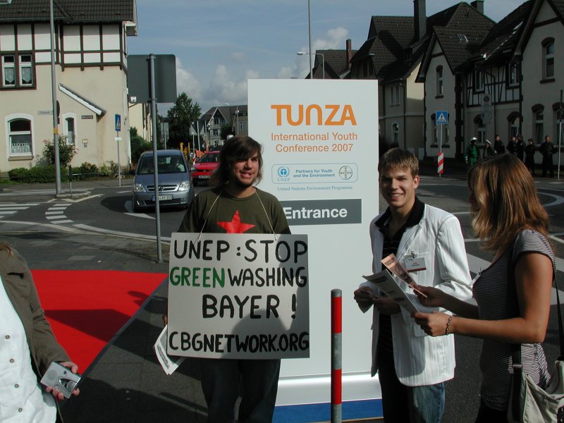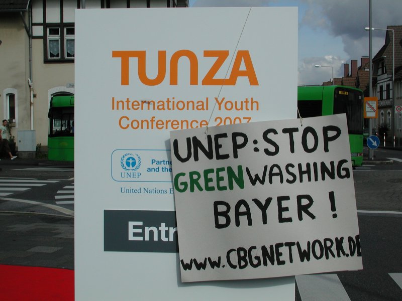 Ende August 2007 fand in Leverkusen eine Konferenz der UN-Umweltbehörde UNEP statt, an der 150 jugendliche Umweltschützer aus aller Welt teilnahmen. Finanziert wurde die viertägige Tagung ausgerechnet vom Chemie- und Pharmaunternehmen BAYER. Der Konzern stellte nicht nur die Räumlichkeiten zu Verfügung, sondern gestaltete auch Teile des Programms und betrieb die Konferenz-Webseite.